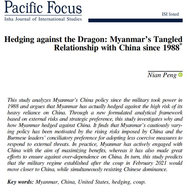 Nian Peng (2021), Hedging Against the Dragon: Myanmar’s Tangled Relations with China since 1988,Pacific Focus(SSCI), Vol.36, No.2. https://doi.org/10.1111/pafo.12191... View More